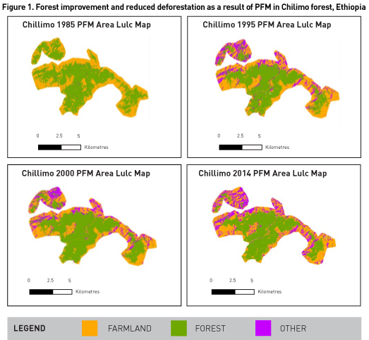 It takes years before changes in forest condition can be reliably measured. In Chilimo, where the first pilot was launched 20 years ago, satellite imagery confirms that not only has deforestation been halted, but forest condition has actually been restored (Table 1 and Figure 1).