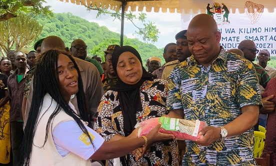 Here, Hon Mtaka is being given a pack of quality-declared seeds, which help ensure a sustainable supply of sorghum throughout the year.