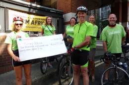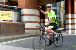 Photos: Tim Jury arriving at the Farm Africa office in central London after a 75 mile bike ride