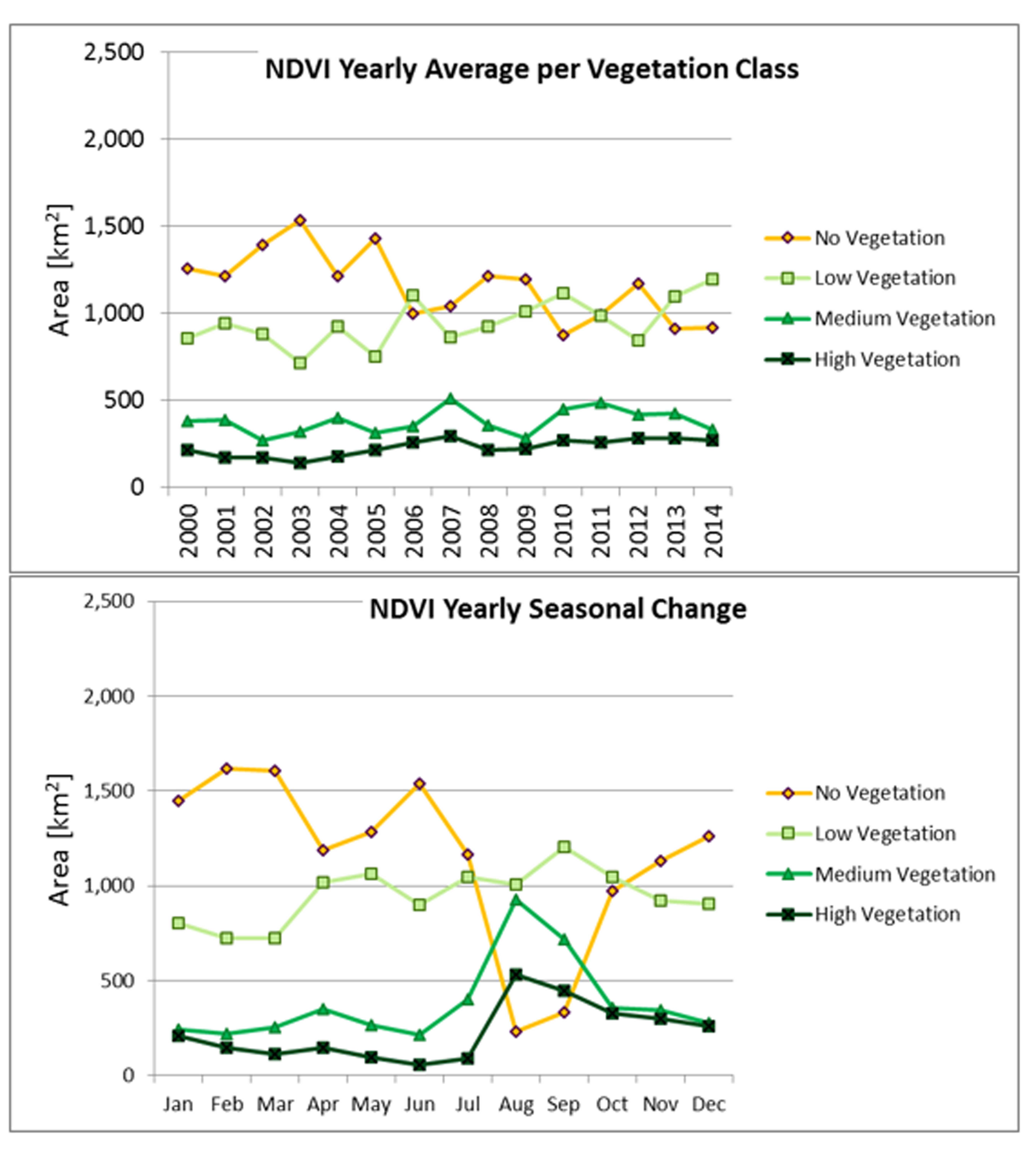 In order to measure change and monitor the vegetation “greenness” in these rangeland areas, the LTS team needed to understand the historical trends of vegetation “greenness” in the site of interest. To measure vegetation “greenness”, 15 years of historical satellite imagery (2000 – 2014) was acquired from two different satellites. The data was then used to compute the Normalised Difference Vegetation Index (NDVI), which measures the “greenness” of the land and is widely used as a proxy for vegetation in monitoring land cover changes. Figure 2 shows NDVI vegetation changes over the fifteen-year period in the project area. An animation of the fifteen-year analysis can be seen online at http://t.co/PoIQev5Cm8.