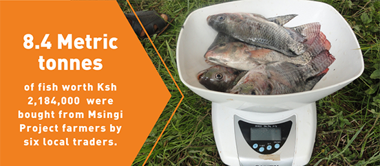 To open up access to markets, the Msingi Project identified six local off-takers who collectively purchased 8.4 metric tonnes of fish valued at Ksh 2,184,000 from farmers in the three project counties. Through the business training conducted throughout the project life-time, farmers changed their approach from doing fish farming as a hobby to commercialising it with 97% of their fish being sold and only 3% being consumed by families.