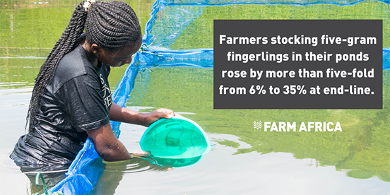 The proposition for bigger fingerlings was drawn from a study conducted by Farm Africa and WorldFish in 2018, which found that the use of fingerlings weighing five grams and above reduces the duration of fish farmers’ production cycles by up to two months and also decreases input costs, thus improving farmers’ productivity and profits.