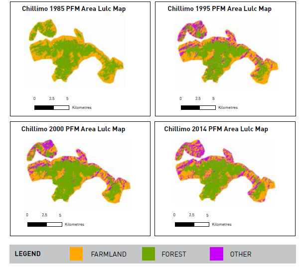 Community and forest cooperative leaders Ato Tessema, Ato Abera, Ato Ashibru and W/ro Seregatu were clear during my visit in telling me that ‘Farm Africa saved the forest’, which is now thriving at 5,000ha. The impact that PFM has had in halting, and even reversing deforestation, in Chilimo is impressive, as seen by this satellite imagery.