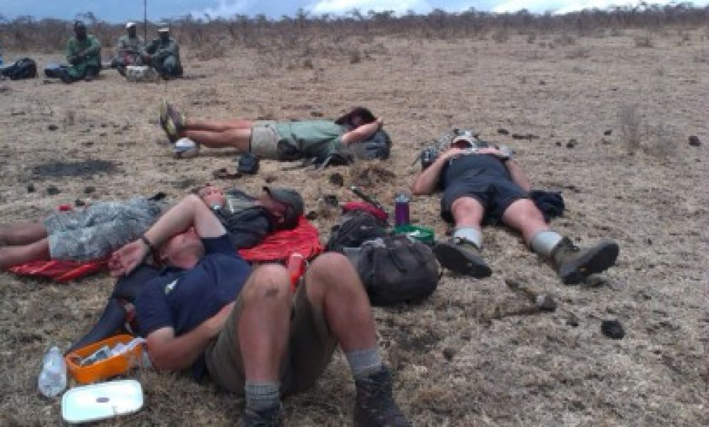 We were awoken at 6am as normal, having slept through our worst night so far due to gale force winds on a mountain top at just over 9000 feet. After breakfast and an over subscribed foot clinic to repair ever deteriorating feet, including my own, we filled our water bottles and rations in preparations for what was to be the longest trek so far on our journey to lake Natron.