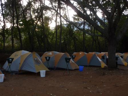 After the longest trek of the challenge, and after walking for almost 12 hours and descending from 10000 to 1300 feet, and covering a distance of over 34 km we finally made camp as darkness was falling. One feature of arriving in camp is to find out where your tent has been placed. The prime location is central and closest to the mess tent. To be placed on the outer extremities, closest to the threat of wildlife and the long drop, clearly has certain disadvantages (although not necessarily so in the case of the long drop).