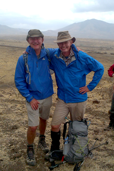Photo: Tanzania trekkers Robert Lasseter (left) and Andrew Thompson prepare to board the flight to Nairobi.