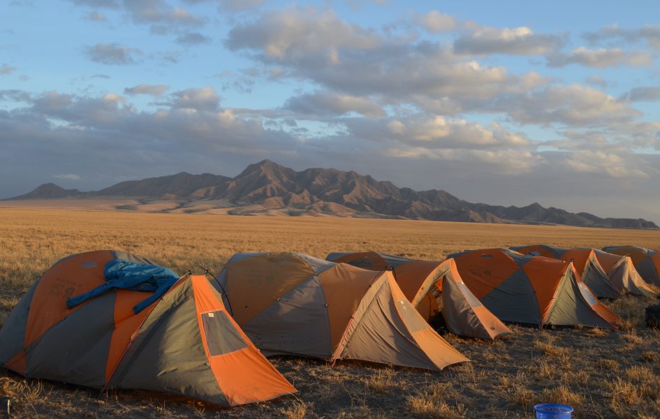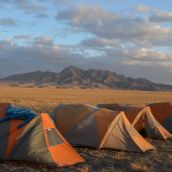 Last night having arrived in camp at dusk, we had to wait around for the crew to set up camp after they'd taken all day to drive to meet us, in itself a heck of a feat. Camp was particularly basic and the main features of the night were a constant strong wind and lava dust blowing into every conceivable corner of one's body and tent. Not much sleep!