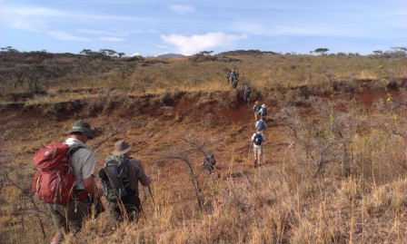 Photo: The team trekking in the blazing heat on Day 3 of the Tanzania Highland Challenge
